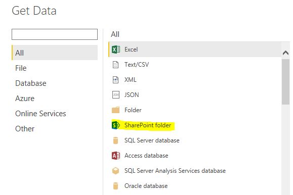 2. A window with all the data sources will appear. Select SharePoint folder from the left pane.